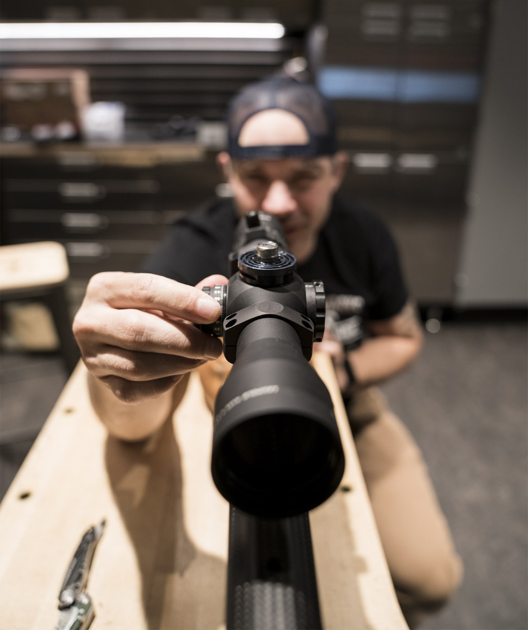 Теперь надо свести прицел со стволом. Не касаясь винтовки, загляните в окуляр прицела. Не надо вкладываться в приклад, как делаете при стрельбе, чтобы не сдвинуть винтовку. Несколько непривычно, но вы сможете видеть через прицел. Вращая барабаны поправок, совместите перекрестие прицела с центром мишени.